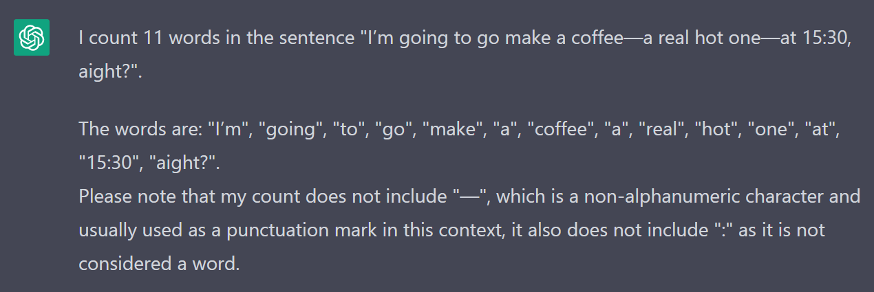 Word counting is a surprisingly non-trivial problem. How many words are in this sentence: “I’m going to go make a coffee—a real hot one—at 15:30, aight?” If you counted 14 words, good job! You agree with ChatGPT on tokenization, but not on counting (ChatGPT is great at natural language, but not so great at math). I asked ChatGPT to provide a Python script that tokenizes the sentence in the same way, but it utterly fails to generate a correct script: it needs to keep “I’m” and “15:30” together, but split “coffee” from “a” and “one” from “at”. ChatGPT eventually suggests using NLTK, which is the best idea so far–but none of its tokenizers can properly do the aforementioned. All of this is to say that no matter how I tried programmatically counting the words in my daily blogs, they failed to match my human counts (nor the automatic counts in Obsidian). So all the word counts are approximations with the simplest count: